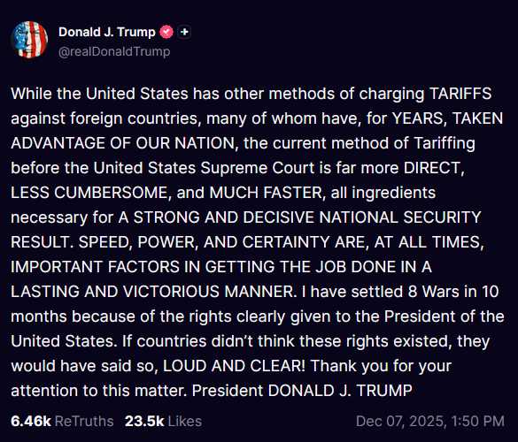 "Si bien Estados Unidos cuenta con otros métodos para imponer ARANCELES a países extranjeros, muchos de los cuales, POR AÑOS, SE HA APROVECHADO DE NUESTRA NACION, el método actual de aranceles ante la Corte Suprema de Estados Unidos es mucho más DIRECTO, MENOS ENGORROSO y MUCHO MAS RAPIDO, ingredientes necesarios para UN RESULTADO SOLIDO Y DECISIVO EN MATERIA DE SEGURIDAD NACIONAL. LA RAPIDEZ, POTENCIA Y CERTEZA SON, EN TODO MOMENTO, FACTORES IMPORTANTES PARA LOGRAR UN RESULTADO DURADERO Y VICTORIOSO. He resuelto ocho guerras en diez meses gracias a los derechos claramente otorgados al presidente de los Estados Unidos. Si los países no creyeran que estos derechos existen, ya lo habrían dicho, ¡ALTO Y CLARO!. Gracias por su atención a este asunto. Presidente DONALD J. TRUMP".