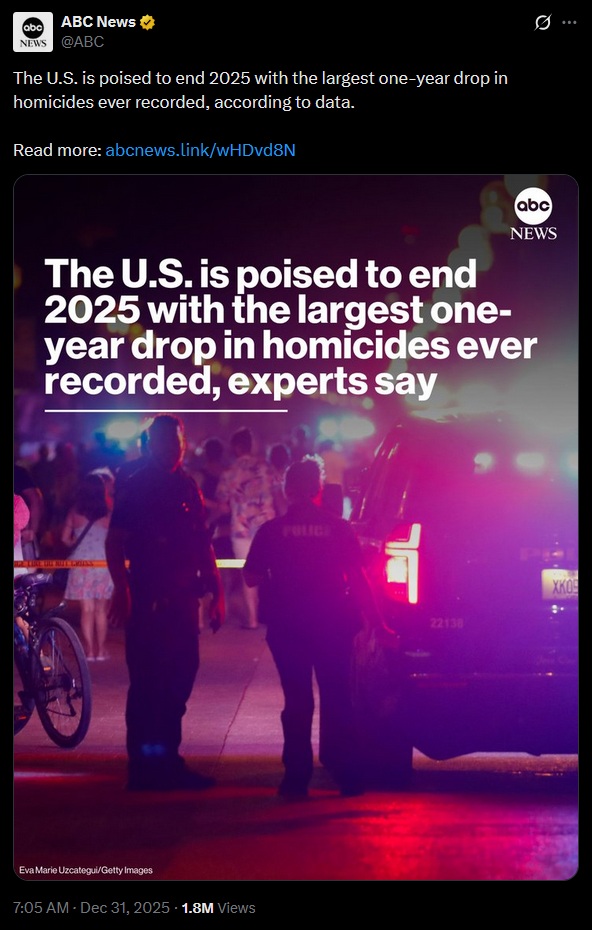 "Según los datos disponibles, Estados Unidos está a punto de terminar 2025 con la mayor disminución anual de homicidios jamás registrada".
