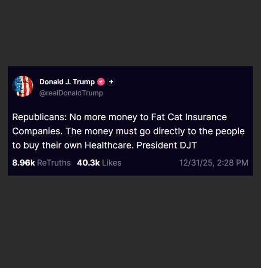 "Republicanos: No más dinero para las grandes compañías de seguros. El dinero debe ir directamente a la gente para que compren su propia atención médica. Presidente DJT"