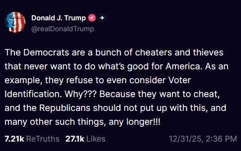 "Los demócratas son un montón de tramposos y ladrones que nunca quieren hacer lo que es bueno para Estados Unidos. Por ejemplo, se niegan a siquiera considerar la identificación de votantes. ¿Por qué? Porque quieren hacer trampa, y los republicanos no deberían tolerar esto, ni muchas otras cosas similares, nunca más".