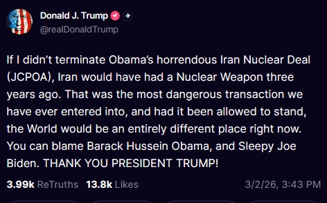 "Si no hubiera cancelado el horrendo Acuerdo Nuclear con Irán (JCPOA) de Obama, Irán habría tenido un arma nuclear hace tres años. Esa fue la transacción más peligrosa que jamás hayamos firmado, y si se hubiera permitido, el mundo sería un lugar completamente diferente ahora mismo. Pueden culpar a Barack Hussein Obama y al dormilón Joe Biden. ¡GRACIAS, PRESIDENTE TRUMP!"