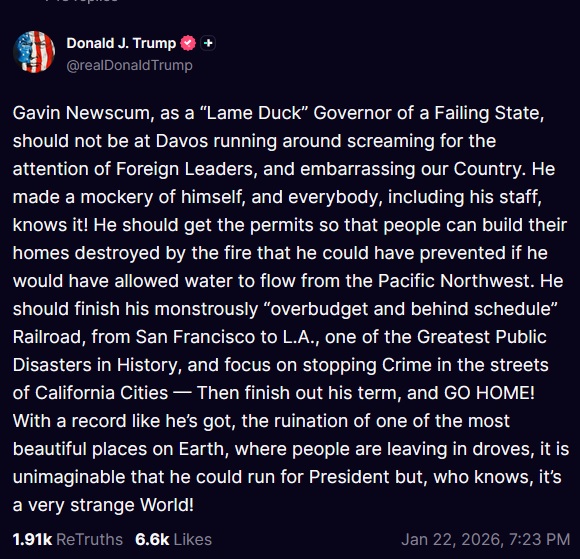 "Gavin Newscum, como gobernador saliente de un estado en decadencia, no debería estar en Davos correteando y buscando la atención de líderes extranjeros, avergonzando a nuestro país. Hizo el ridículo, y todo el mundo, incluido su personal, lo sabe. Debería conceder los permisos para que la gente pueda reconstruir sus casas destruidas por el incendio que él podría haber evitado si hubiera permitido que el agua fluyera desde el noroeste del Pacífico. Debería terminar su monstruoso proyecto de ferrocarril, con un presupuesto desorbitado y un retraso considerable, entre San Francisco y Los Ángeles, uno de los mayores desastres públicos de la historia, y centrarse en detener la delincuencia en las calles de las ciudades californianas. Luego, debería terminar su mandato e IRSE A CASA. Con el historial que tiene, la ruina de uno de los lugares más bellos de la Tierra, de donde la gente se marcha en masa, es inimaginable que pueda presentarse a la presidencia, pero quién sabe, ...