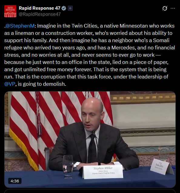 "Imaginen en las Ciudades Gemelas a un nativo de Minnesota que trabaja como electricista o como obrero de la construcción, y que está preocupado por su capacidad para mantener a su familia. Y luego imaginen que tiene un vecino —un refugiado somalí que llegó hace dos años— que posee un Mercedes, que no tiene ninguna presión económica ni preocupación alguna, y a quien nunca se le ve ir a trabajar; todo ello porque simplemente acudió a una oficina estatal, mintió en un formulario y obtuvo dinero público ilimitado y gratuito para siempre. Ese es el sistema que se está operando. Esa es la corrupción que este grupo de trabajo va a desmantelar, bajo el liderazgo del Vice Presidente".