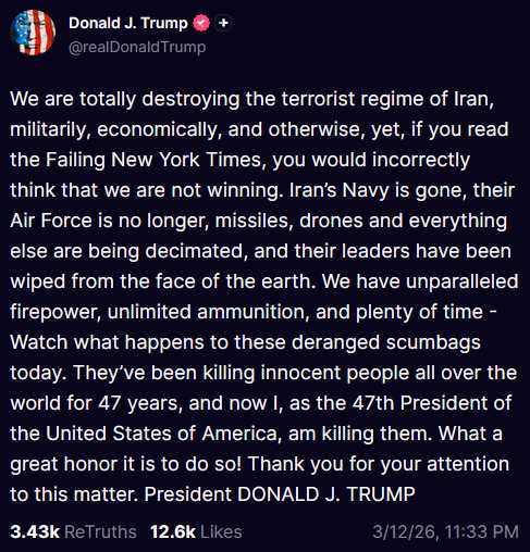 "Estados Unidos es, de lejos, el mayor productor de petróleo del mundo, así que cuando los precios del petróleo suben, ganamos mucho dinero. PERO, como presidente, para mí es de mucho mayor interés e importancia, el impedir que un imperio malvado, Irán, posea armas nucleares y destruya Medio Oriente y, de hecho, el mundo. ¡Jamás permitiré que eso suceda! Gracias por su atención a este asunto. Presidente DONALD J. TRUMP".