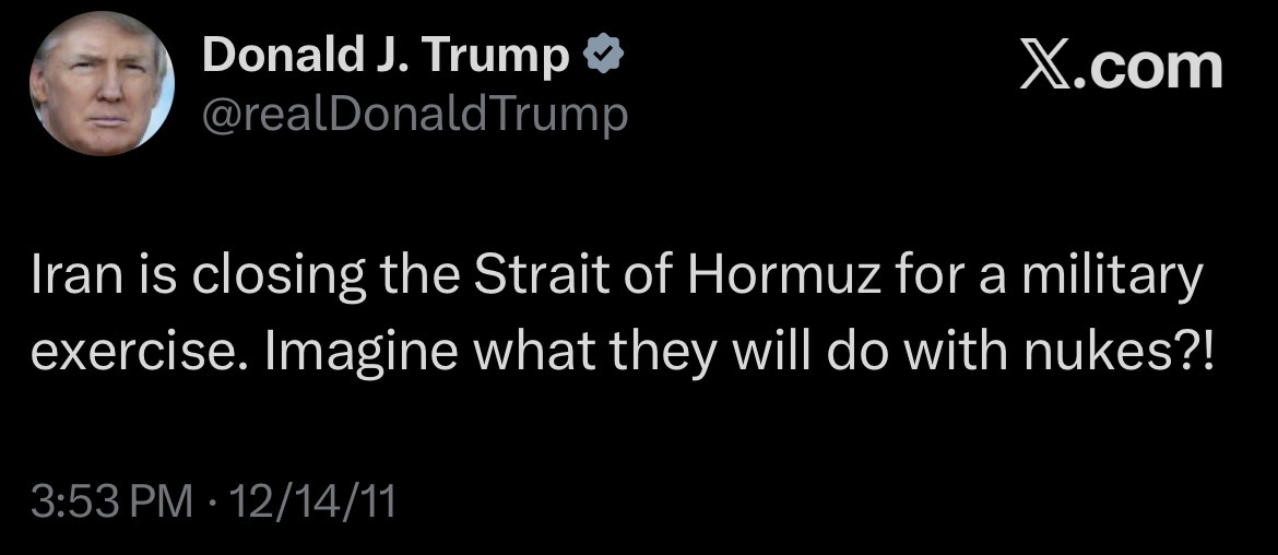 “Irán está cerrando el estrecho de Ormuz por un ejercicio militar. Imagina ¡¿que harán con armas nucleares?!”.
