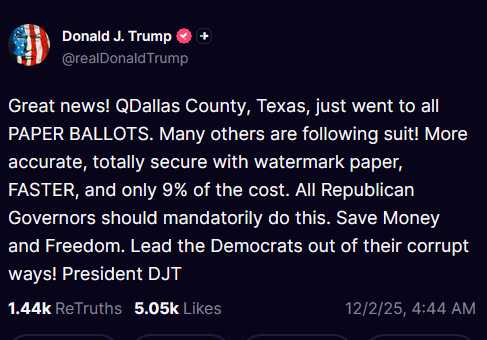 "¡Buenas noticias! El Condado de QDallas, Texas, acaba de adoptar el sistema de BOLETAS DE PAPEL. ¡Muchos otros están siguiendo el ejemplo! Más preciso, totalmente seguro con marca de agua, MÁS RÁPIDO y solo el 9% del costo. Todos los gobernadores republicanos deberían hacerlo obligatorio. ¡Ahorras dinero y libertad! ¡Dejen la corrupción de los demócratas! Presidente DJT"