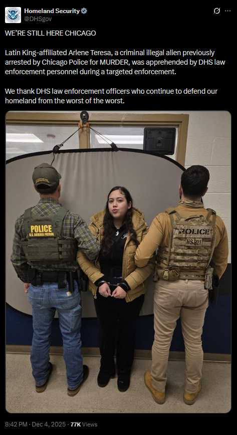 Arlene Teresa, afiliada a Latin King y extranjera indocumentada, fue arrestada por la Policía de Chicago por ASESINATO. Fue detenida por agentes del DHS durante una operación policial específica.