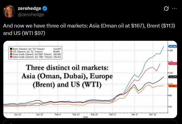 "Y ahora tenemos tres mercados del petróleo: Asia (petróleo Oman a $167 [x barril]), Brent ($113) y EEUU (WTI $97)".