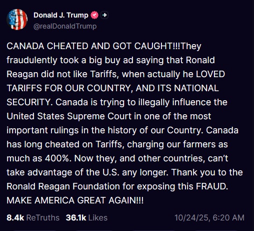 "¡CANADÁ HIZO TRAMPA Y FUE ATRAPADO! Compraron fraudulentamente un anuncio de alto costo que decía que a Ronald Reagan no le gustaban los aranceles, cuando en realidad LE ENCANTABAN LOS ARANCELES PARA NUESTRO PAIS Y PARA SU SEGURIDAD NACIONAL. Canadá está tratando de influenciar ilegalmente en la Corte Suprema de Estados Unidos con uno de los fallos más importantes en la historia de nuestro país. Canadá nos ha engañado con los aranceles durante mucho tiempo, cobrando a nuestros agricultores hasta un 400%. Ahora, ni ellos ni otros países pueden seguir aprovechándose de EEUU. Gracias a la Fundación Ronald Reagan por exponer este FRAUDE. ¡¡¡HAGAMOS A ESTADOS UNIDOS GRANDE DE NUEVO!!!"