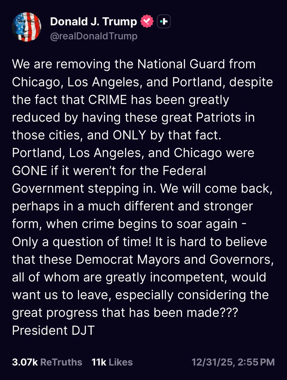 “Estamos retirando a la Guardia Nacional de Chicago, Los Ángeles y Portland, a pesar del hecho de que el CRIMEN se ha reducido en gran medida al tener a estos grandes patriotas en esas ciudades, y SOLO por ese hecho. Portland, Los Ángeles y Chicago se HABRÍAN PERDIDO si no fuera por la intervención del Gobierno Federal. Volveremos, tal vez de una forma muy diferente y más fuerte, cuando el crimen comience a aumentar de nuevo - ¡es solo es cuestión de tiempo! Es difícil de creer que esos alcaldes y gobernadores demócratas, todos los cuales son muy incompetentes, quieran que nos vayamos, especialmente teniendo en cuenta el gran progreso que se ha hecho. Presidente DJT”