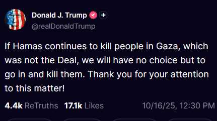 "Si Hamás continúa mantando gente en Gaza, lo cual no fue el trato, no tendremos más opción que ir y matarlos a ellos. ¡Gracias por su atención a este asunto!"