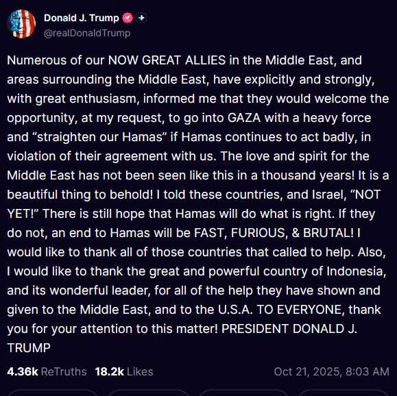 "Muchos de nuestros AHORA GRANDES ALIADOS en Medio Oriente y sus alrededores me han informado explícita y firmemente, con gran entusiasmo, que acogerían con agrado la oportunidad, a petición mía, de ir a Gaza con un gran contingente militar y "enderezar a Hamás" si este continúa actuando mal, violando su acuerdo con nosotros. ¡Un amor y espíritu por Medio Oriente no se ha visto así en mil años! ¡Es algo hermoso de contemplar! Les dije a esos países y a Israel: "¡TODAVÍA NO!". Aún hay esperanza de que Hamás haga lo correcto. Si no lo hace, su fin será RÁPIDO, FURIOSO y BRUTAL. Quisiera agradecer a todos los países que ofrcieron ayuda. También quiero agradecer al gran y poderoso país de Indonesia y a su maravilloso líder por toda la ayuda que han mostrado y brindado a Medio Oriente y a Estados Unidos. A TODOS, ¡gracias por su atención a este asunto! PRESIDENTE DONALD J. TRUMP"