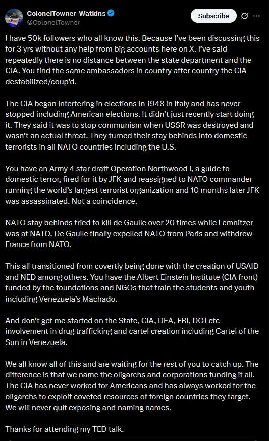 "Tengo 50,000 seguidores que saben esto. Porque llevo 3 años discutiendo esto sin la ayuda de grandes cuentas aquí en X. He dicho repetidamente que no hay distancia entre el Departamento de Estado y la CIA. En un país tras otro que la CIA desestabilizó o hizo un golpe, encuentras a los mismos embajadores.