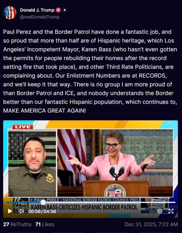 "Paul Pérez y la Patrulla Fronteriza han hecho un trabajo fantástico, y me enorgullece que más de la mitad sean de origen hispano, algo de lo cual se quejan la alcaldesa incompetente de Los Ángeles, Karen Bass (quien ni siquiera ha conseguido los permisos para que la gente reconstruya sus casas después del incendio sin precedentes que ocurrió), y otros políticos de tercera categoría. Nuestras cifras de reclutamiento están en niveles RECORD, y así seguiremos. No hay ningún grupo del que me sienta más orgulloso que la Patrulla Fronteriza y ICE, y nadie entiende mejor la frontera que nuestra fantástica población hispana, la cual sigue contribuyendo a HACER A ESTADOS UNIDOS GRANDE OTRA VEZ".