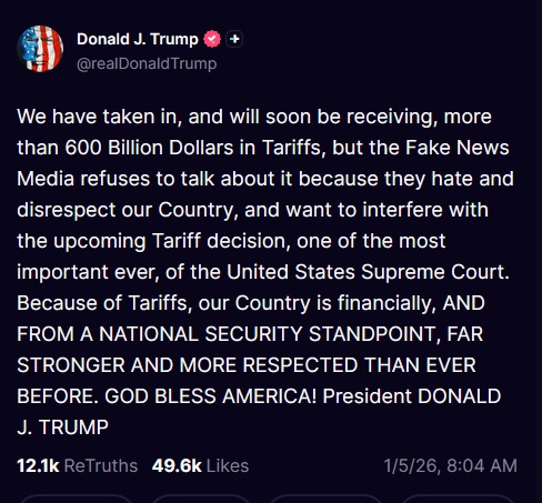 "Hemos recaudado, y pronto recibiremos, más de 600 mil millones de dólares en aranceles, pero los medios de comunicación de noticias falsas se niegan a hablar de ello porque odian y le faltan el respeto a nuestro país, y quieren interferir en la próxima decisión sobre aranceles, una de las más importantes de la historia, de la Corte Suprema de los Estados Unidos. Gracias a los aranceles, nuestro país es financiera Y, DESDEL EL PUNTO DE VISTA DE SEGURIDAD NACIONAL, MUCHO MAS FUERTE Y RESPETADO QUE NUNCA. ¡DIOS BENDIGA A ESTADOS UNIDOS! Presidente DONALD J. TRUMP"