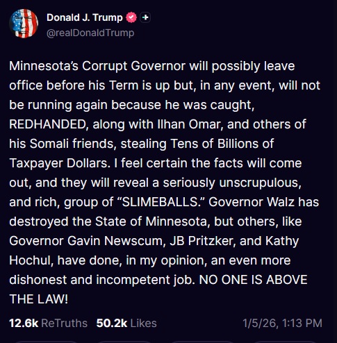 "El corrupto gobernador de Minnesota probablemente dejará el cargo antes de que termine su mandato, pero en cualquier caso, no se presentará a la reelección porque fue sorprendido IN FRAGANTI, junto con Ilhan Omar y otros de sus amigos somalíes, robando decenas de miles de millones de dólares de los contribuyentes. Estoy seguro de que los hechos saldrán a la luz y revelarán a un grupo de individuos sumamente inescrupulosos. El gobernador Walz ha destruido el estado de Minnesota, pero otros, como los gobernadores Gavin Newsom, JB Pritzker y Kathy Hochul, han hecho, en mi opinión, un trabajo aún más deshonesto e incompetente. ¡NADIE ESTA POR ENCIMA DE LA LEY!"
