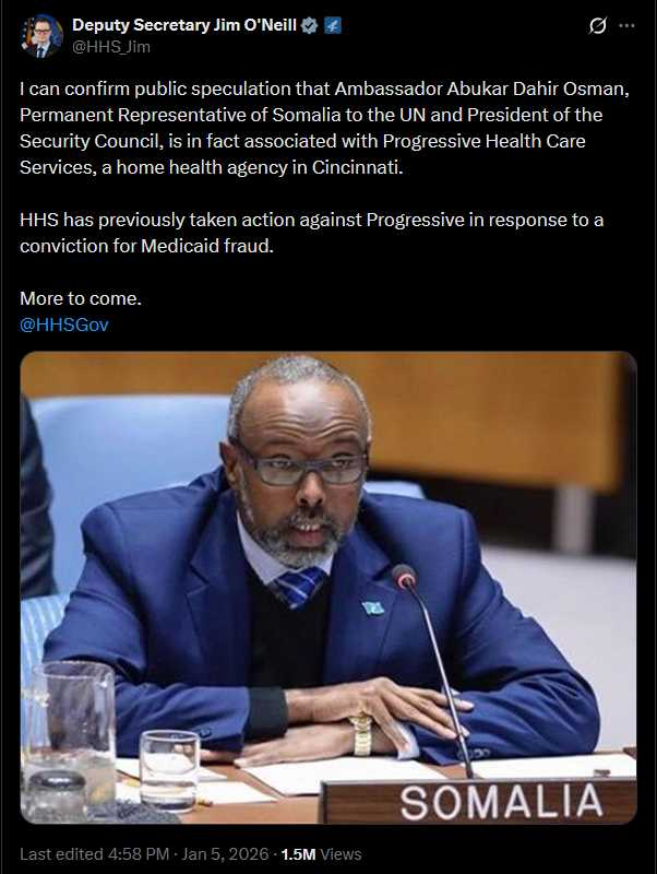 "Puedo confirmar las especulaciones públicas de que el embajador Abukar Dahir Osman, Representante Permanente de Somalia ante las Naciones Unidas y Presidente del Consejo de Seguridad [de la ONU], está efectivamente vinculado a Progressive Health Care Services, una agencia de atención médica a domicilio con sede en Cincinnati.