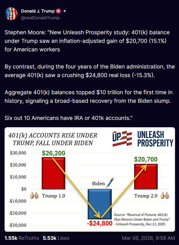 "Stephen Moore: “Nuevo estudio de Unleash Prosperity: El saldo de los planes 401(k) bajo la administración de Trump registró una ganancia ajustada a la inflación de $20,700 (15.1%) para los trabajadores estadounidenses.
