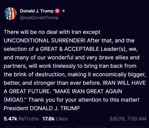 "¡No habrá acuerdo con Irán, excepto una RENDICIÓN INCONDICIONAL! Después de eso, y tras la elección de un líder(es) GRANDE Y ACEPTABLE, nosotros, junto con muchos de nuestros maravillosos y valientes aliados y socios, trabajaremos incansablemente para rescatar a Irán del borde de la destrucción, haciéndolo económicamente más grande, mejor y más fuerte que nunca. IRÁN TENDRÁ UN GRAN FUTURO. “¡HAGAMOS A IRÁN GRANDE DE NUEVO (MIGA)!”. ¡Gracias por su atención a este asunto! Presidente DONALD J. TRUMP"