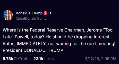 "¿Dónde está hoy el presidente de la Reserva Federal, Jerome «Tardón» Powell? ¡Debería bajar las tasas de interés INMEDIATAMENTE, y no esperar a la próxima reunión! Presidente DONALD J. TRUMP"