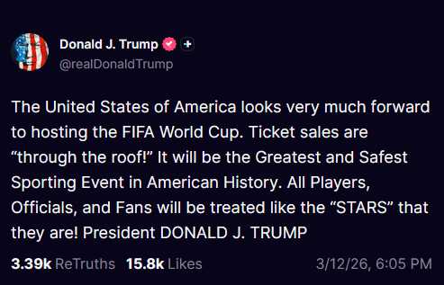 "Los Estados Unidos de América esperan con gran entusiasmo ser la sede de la Copa Mundial de la FIFA. ¡La venta de entradas está «por las nubes»! Será el evento deportivo más grandioso y seguro de la historia de Estados Unidos. ¡Todos los jugadores, oficiales y aficionados serán tratados como las «ESTRELLAS» que son! Presidente DONALD J. TRUMP"