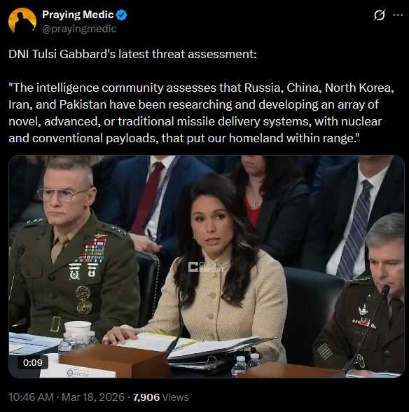 "La comunidad de inteligencia estima que Rusia, China, Corea del Norte, Irán y Pakistán han estado investigando y desarrollando una gama de sistemas de lanzamiento de misiles —novedosos, avanzados o tradicionales—, con cargas útiles nucleares y convencionales, que ponen a nuestro territorio nacional dentro de su alcance".